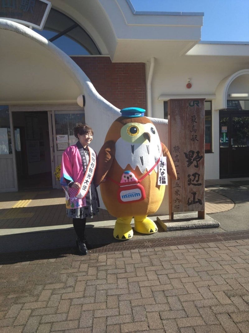 駅舎にて南牧村マスコットキャラクターの「みな福」と記念撮影を行いました。